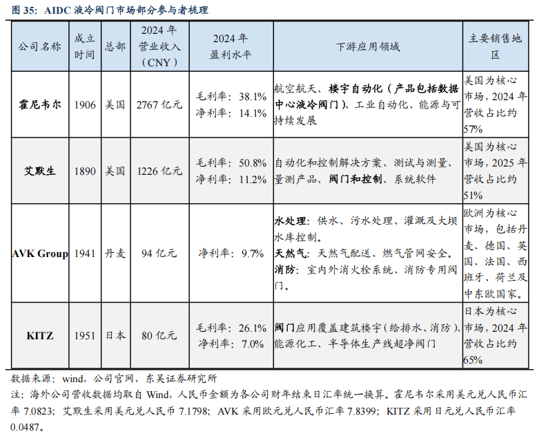 海外龙头主导液冷市场,国产品牌有望加速突破。阀门直接影响数据中心液冷系统的正常运行,且占项目投资比率相对较低,客户对价格敏感度低、更重视产品可靠性。目前数据中心液冷阀门市场主要由霍尼韦尔、派克汉尼汾等海外一线品牌主导,国内厂商渗透率较低。近年来,随着国产品牌主动出海,于海外市场的影响力持续增强,客户认可度逐步提升。更快的交期和更高的产能弹性将帮助国产阀门渗透率持续提升。