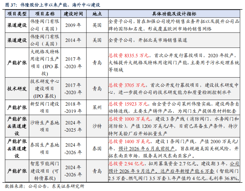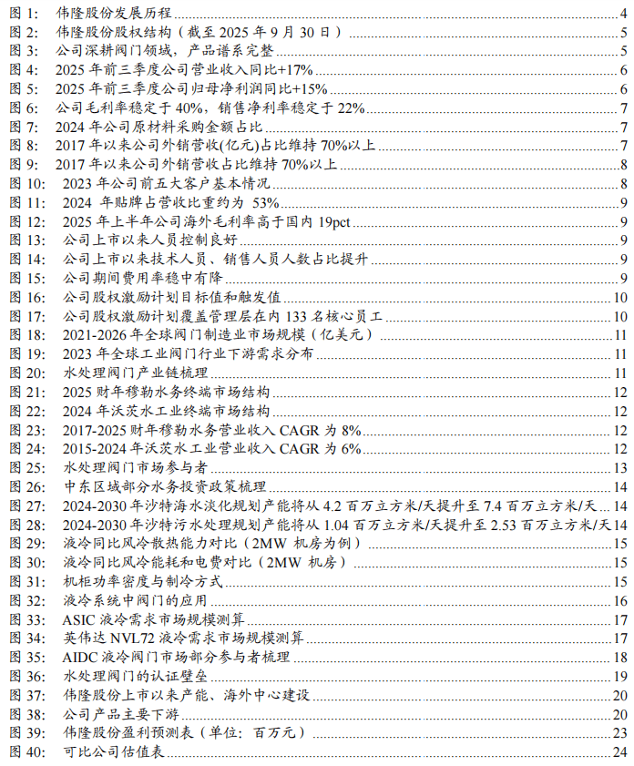 中高端水阀市场准入资质、销售渠道壁垒较高:(1)资质认证壁垒:水务为民生大事,欧美等发达国家对水阀均根据不同行业制定了不同的标准,对供应商生产流程、产品质量等要求严格,且审核周期较长。部分业主方还要求阀门厂进入供应商名单,如沙特要求供应商通过沙特阿美的9COM 认证或SWCC供应商预审,阿布扎比要求供应商进入ADSSC或EWEC的供应商名册,才可参与投标。(2)销售渠道壁垒:水处理阀门行业参与者众多,成熟的品牌、完善的销售网络和高响应的售后服务为壁垒之一。此外,沙特的IKVA计划鼓励企业在当地投资,于沙特本地有投资、雇佣和售后的厂商更容易中标。在此背景下,我们看好伟隆股份成长性:①公司海外资质认证完备、渠道建设较成熟,于泰国、沙特已有产能,先发优势明显。随海外工厂产能释放,关税等压制公司外销的因素逐步消解,公司将充分受益于新兴市场水阀需求的增长。②公司2018年切入数据中心领域,目前已有成熟产品向微软数据中心等供货,主要销往北美和东南亚。公司的液冷阀门覆盖一二次侧,冷却塔、管路以及CDU环节均有。相较海外供应商,公司具备交期短等优势,随客户认可度提升,液冷阀门有望成公司又一增长极。