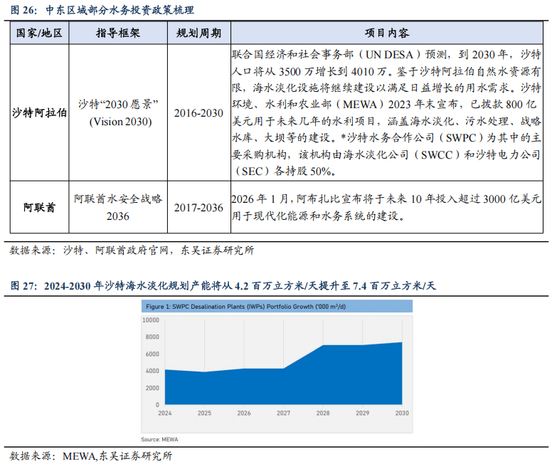 中东和北非为全球最大的供水与污水处理项目市场,城市化和工业化的推进将带动水阀需求持续增长。根据GlobalData,截至2025年末,全球约有6309亿美元的水务和污水处理建设项目(统计口径涵盖前期规划到执行阶段),其中约69%(4375亿美元)的项目处在执行或执行前期(设计、招标和授标)阶段。中东和北非占比最高,达到40%(约2500亿美元,其中GCC成员国占主导地位),这些区域对海水淡化、废水处理依赖度极高,以满足饮用水供应需求。2024-2030年沙特海水淡化规划产能将从4.2百立方米/天提升至7.4百立方米/天,增长约75%;污水处理规划产能将从1.04百立方米/天提升至2.53百立方米/天,翻倍以上增长。
