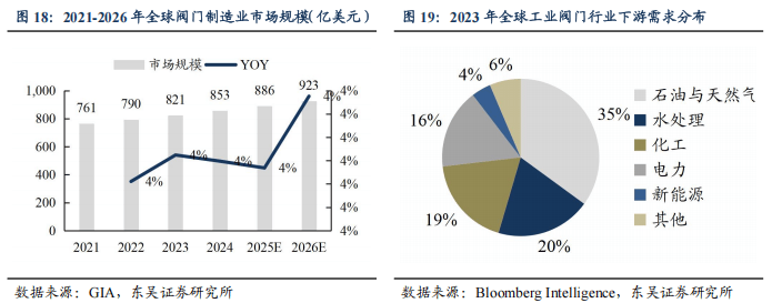 工业阀门应用领域多且分散,市场空间广阔且增长稳定。工业阀门是工业管路上控制或调节流体(液体、气体或浆料)介质流动的重要零部件,下游主要覆盖油气(35%)、水处理(20%)、化工(19%)、电力(16%)等。根据GIA数据,2024年全球阀门制造业市场规模为853亿美元,每年保持3%~5%稳健增长。