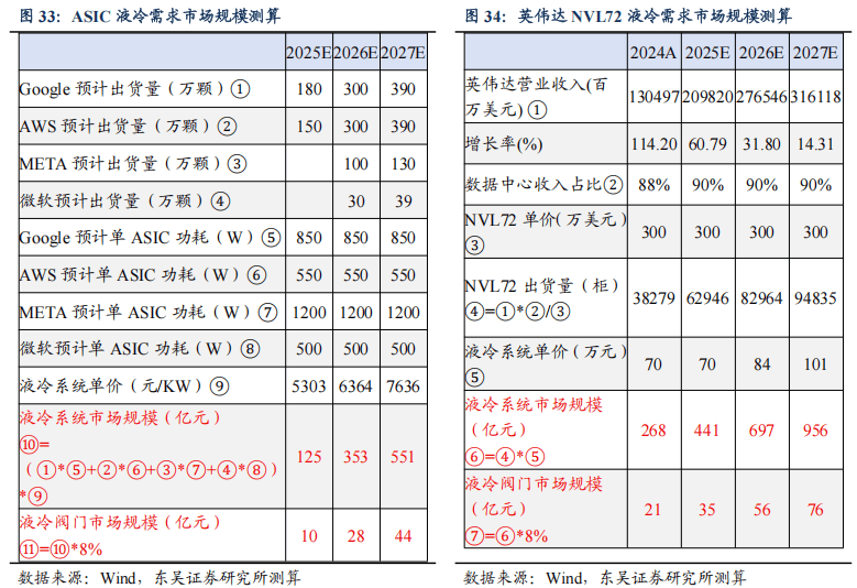 1)ASIC需求:我们假设2025年液冷系统单价为5303元/KW(往后每年价值量提升20%),根据海外大厂26年出货量预期(wind一致预期)和单ASIC功耗,我们测算得26年预计ASIC用液冷系统规模达353亿元。