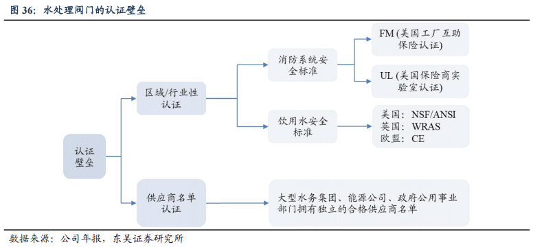 中高端水阀市场准入资质、销售渠道壁垒较高:(1)资质认证壁垒:自来水厂、城镇给排水系统和消防系统的阀门质量影响人的日常生活和身体健康。欧美等发达国家对水阀均根据不同行业制定了不同的标准,英国WRAS、挪威DNV、德国VDS、欧盟CE、美国FM、UL、NSF、澳大利亚WaterMark等,认证机构对供应商的生产流程、产品质量管理体系等均有严格的要求,且周期较长。除了地区性、行业性的强制认证外,部分业主方还要求阀门厂进入供应商名单(AVL,Approved Vendor List),如沙特要求供应商通过沙特阿美的9COM 认证或SWCC(海水淡化局)供应商预审,阿布扎比要求供应商进入ADSSC(污水处理公司)或EWEC(水电采购公司)的供应商名册,才可参与投标。(2)销售渠道壁垒:水处理阀门行业参与者众多,且水务为民生大事,成熟的品牌、完善的销售网络和高响应的售后服务为壁垒之一。此外,沙特的IKVA计划鼓励企业在当地投资,于沙特本地有投资、雇佣和售后的厂商更容易中标。